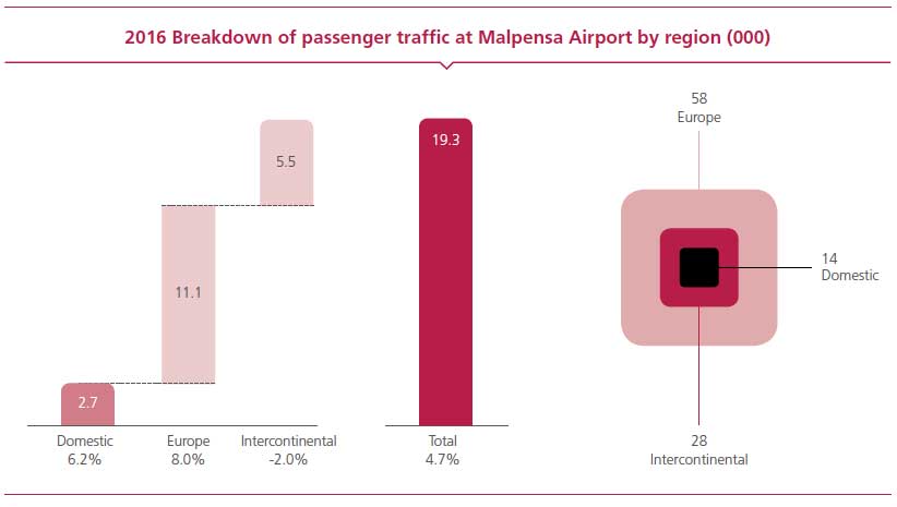 In terms of Malpensa's intercontinental traffic (5.5 million passengers served, a figure which also includes non-EU routes flown by easyJet at Terminal 2), it should be noted that the segment, which reported a -2% performance compared to 2015, was affected by the geopolitical instability of countries on the Middle Eastern part of the Mediterranean Sea and the Maghreb, and the events that involved Turkey. By excluding the Maghreb countries and analysing the performance of long-haul airlines to the remaining areas, a development of +1.6% was reported with 4.9 million passengers served in 2016.
